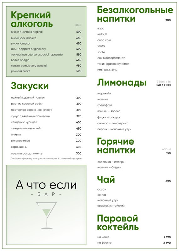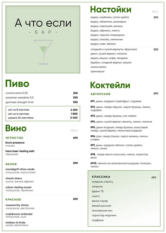 В баре А что если на метро Аэропорт вы можете приятно провести время с друзьями или просто как следует отдохнуть после рабочих будней, а в этом вам с удовольствием помогут наши опытные бармены и ассортимент алкоголя. Они посоветуют варианты горячительного по вкусу и кошельку! Вам нужно лишь рассказать, что предпочитаете: желаемый градус и вкус, состав или производителя. В нашей винной карте мы предлагаем широкий выбор столовых и десертных вин из различных сортов винограда. А к стопке спиртного мы рекомендуем заказать имеющиеся в меню закуски.